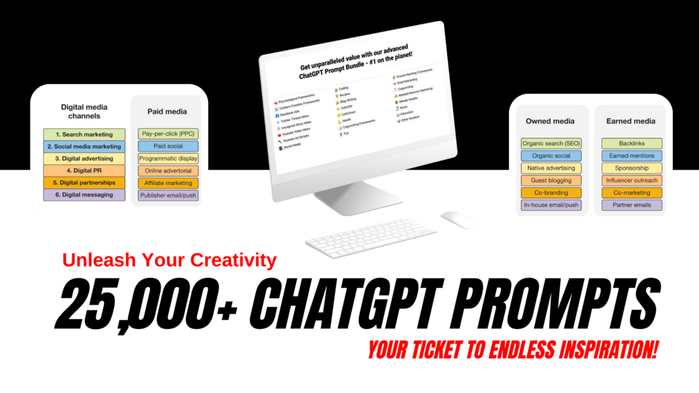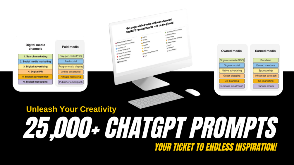 Unlock the potential of your creativity, supercharge your productivity, and embark on a journey of limitless exploration with the "25,000+ ChatGPT Prompts Collection." Don't miss out on this opportunity to revolutionize your creative process and achieve your goals like never before. Grab your copy today and let the magic of ChatGPT propel you towards success!